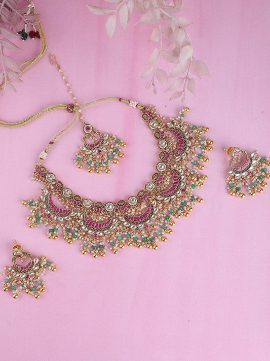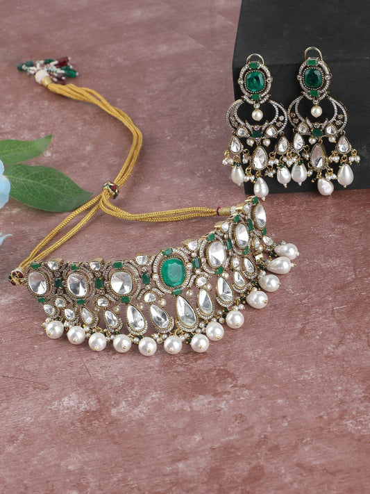 Elegant Green Beaded Choker Necklace Set with Gold-Toned & White Gold Accents