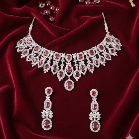 Luxury Silver-Plated Choker Necklace Set with Ruby Red Stones