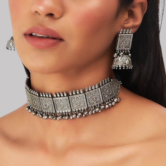 Oxidised Silver-Plated Temple Design Choker Necklace Set with Earrings for Women