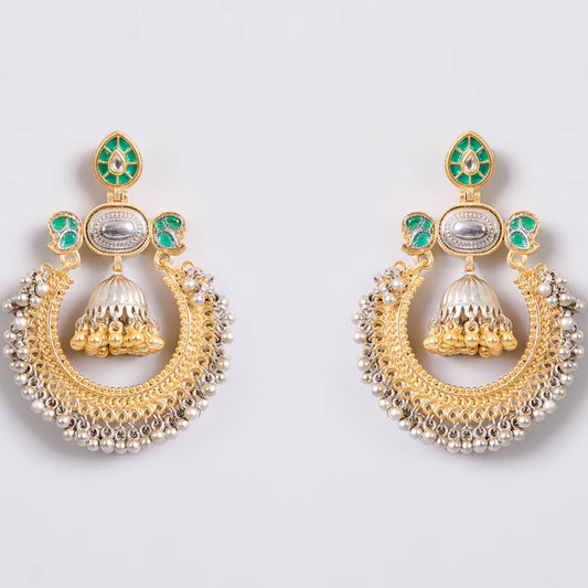 Traditional Gold & Silver-Plated Chandbali Earrings with Green Enamel & Jhumka Drop for Women