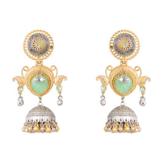 Dual-Tone Gold & Oxidized Silver Jhumka Earrings with Green Stone & Pearl Drops