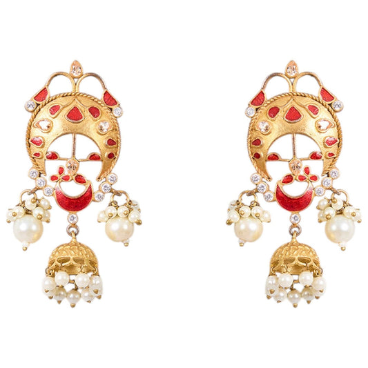 Gold-Plated Red Enamel Jhumka Earrings with Pearl Drops