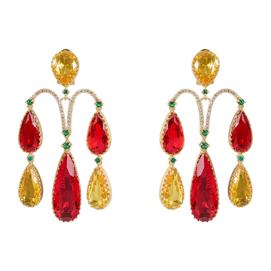 Gold-Plated Red & Yellow Statement Teardrop Earrings with Green Accents