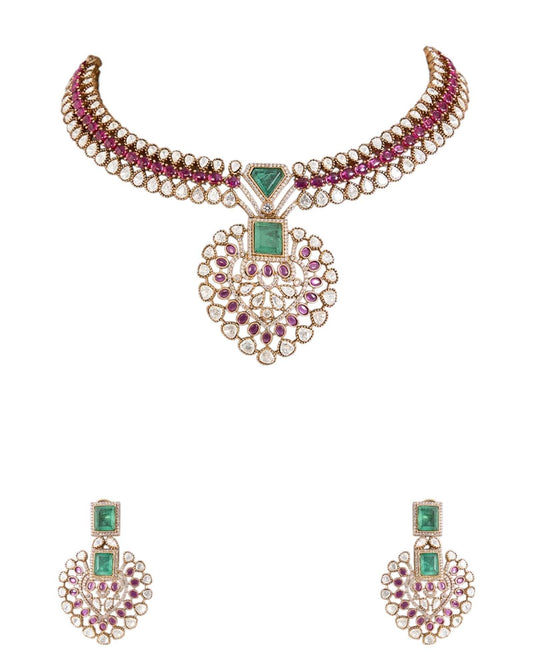 Gold Finish Kundan Polki Choker Necklace Set with Emerald Green Stones – Bridal & Festive Jewelry