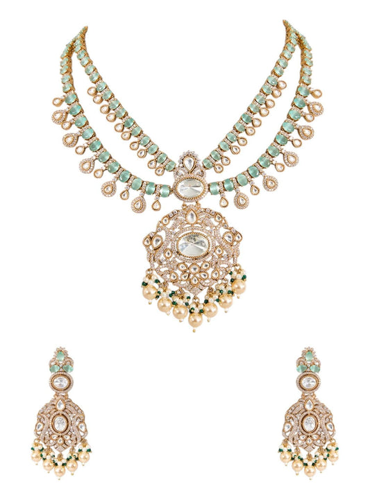 Gold Finish Kundan Polki Pendant Necklace Set with Green Beads – Bridal & Festive Jewelry