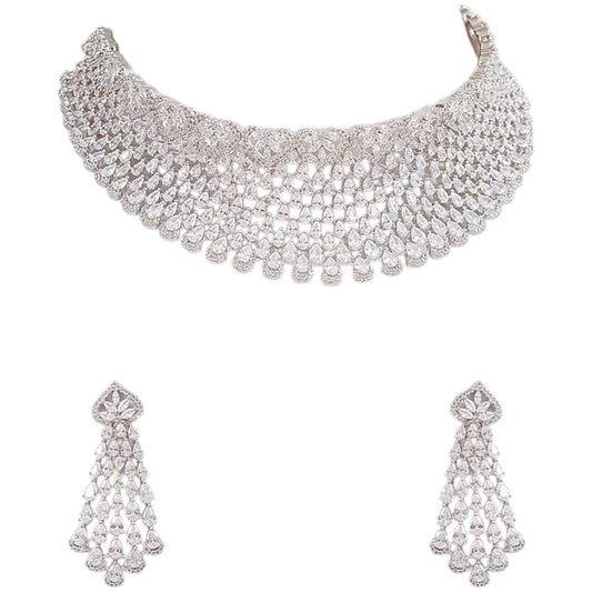 Elegant Diamond Look Silver Choker Necklace Set with Earrings
