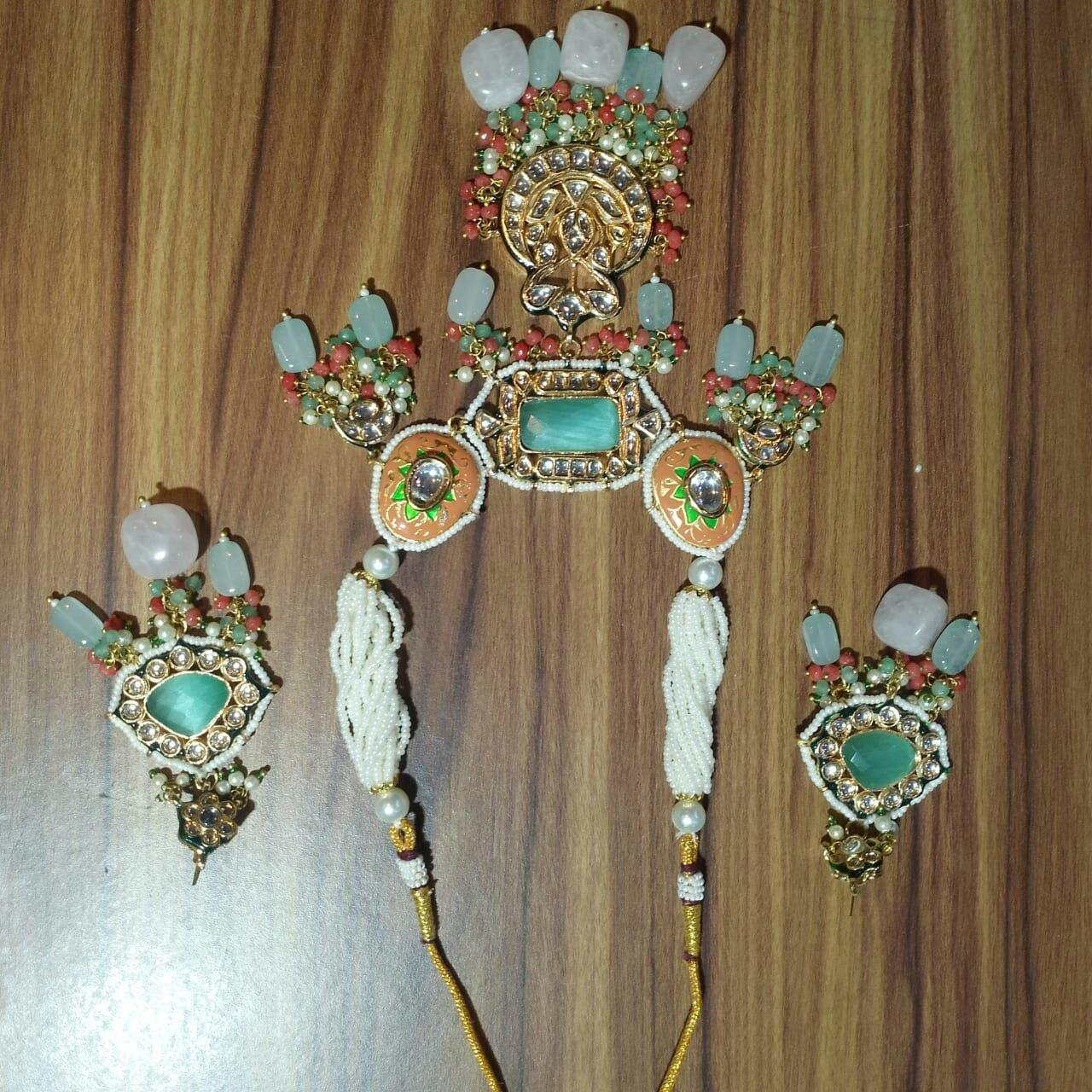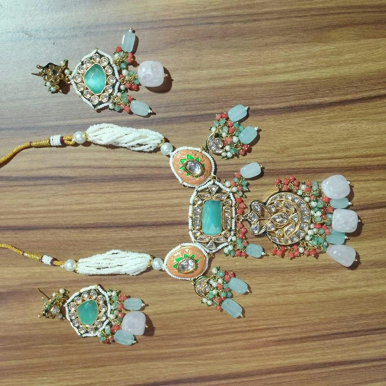 This stunning traditional choker necklace set features intricate Kundan craftsmanship, enhanced with pastel-toned beads, pearls, and semi-precious stones. The necklace is paired with statement drop earrings, showcasing detailed floral motifs and soft hues of green, pink, and gold. Perfect for weddings, festive occasions, and ethnic celebrations, this set exudes timeless elegance and pairs beautifully with lehengas, sarees, or fusion outfits.