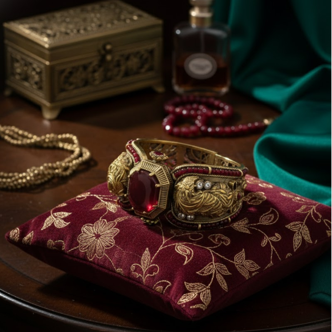 Make a royal statement with this Antique Gold-Plated Green Stone Cuff Bracelet, crafted with exquisite detailing and luxurious vintage charm. Featuring an intricately carved lion motif and a bold green centerpiece stone, this bracelet blends heritage artistry with modern elegance. Perfect for festive occasions, parties, and weddings, this unique piece adds a regal touch to any ethnic or Indo-western outfit. Designed for the confident woman who loves to stand out in style.