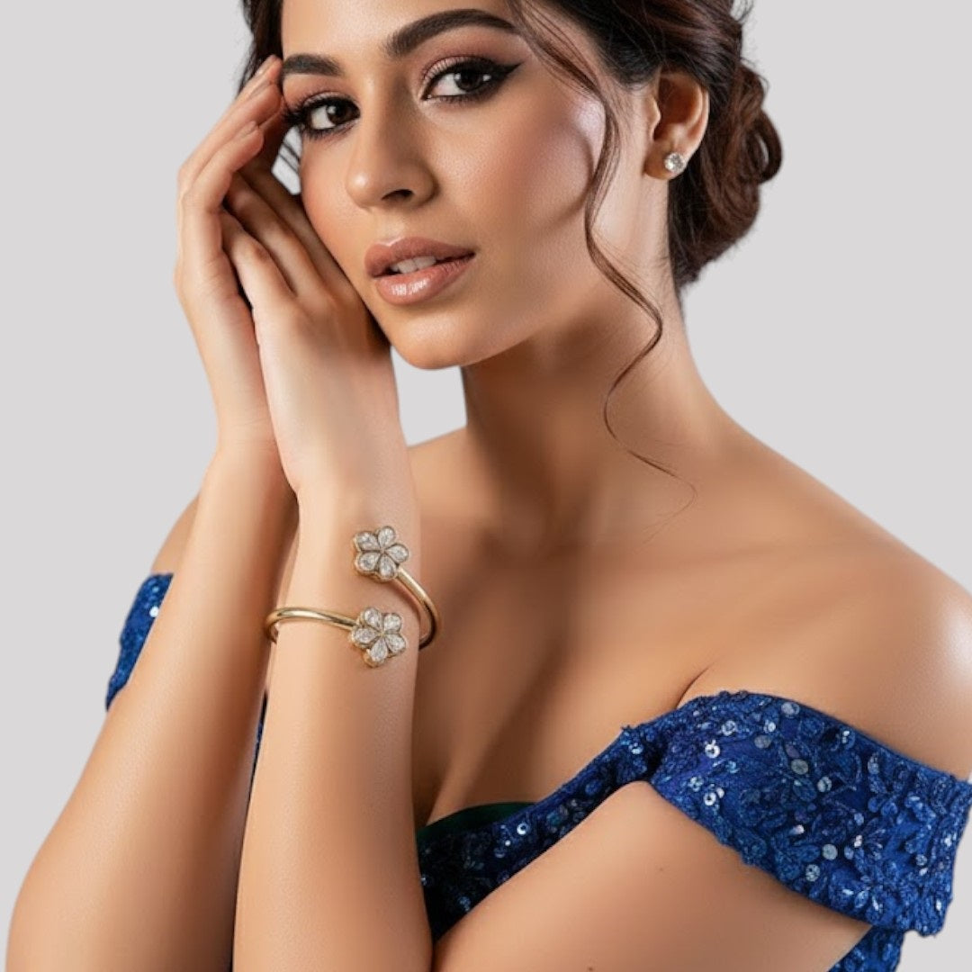 Add a graceful charm to your ethnic or Indo-western attire with this elegant floral open bangle. Crafted with a gold-plated base, this adjustable kada features two floral motifs embellished with sparkling Kundan stones in a delicate petal design. Its open-ended, flexible fit makes it perfect for various wrist sizes while offering all-day comfort and style.