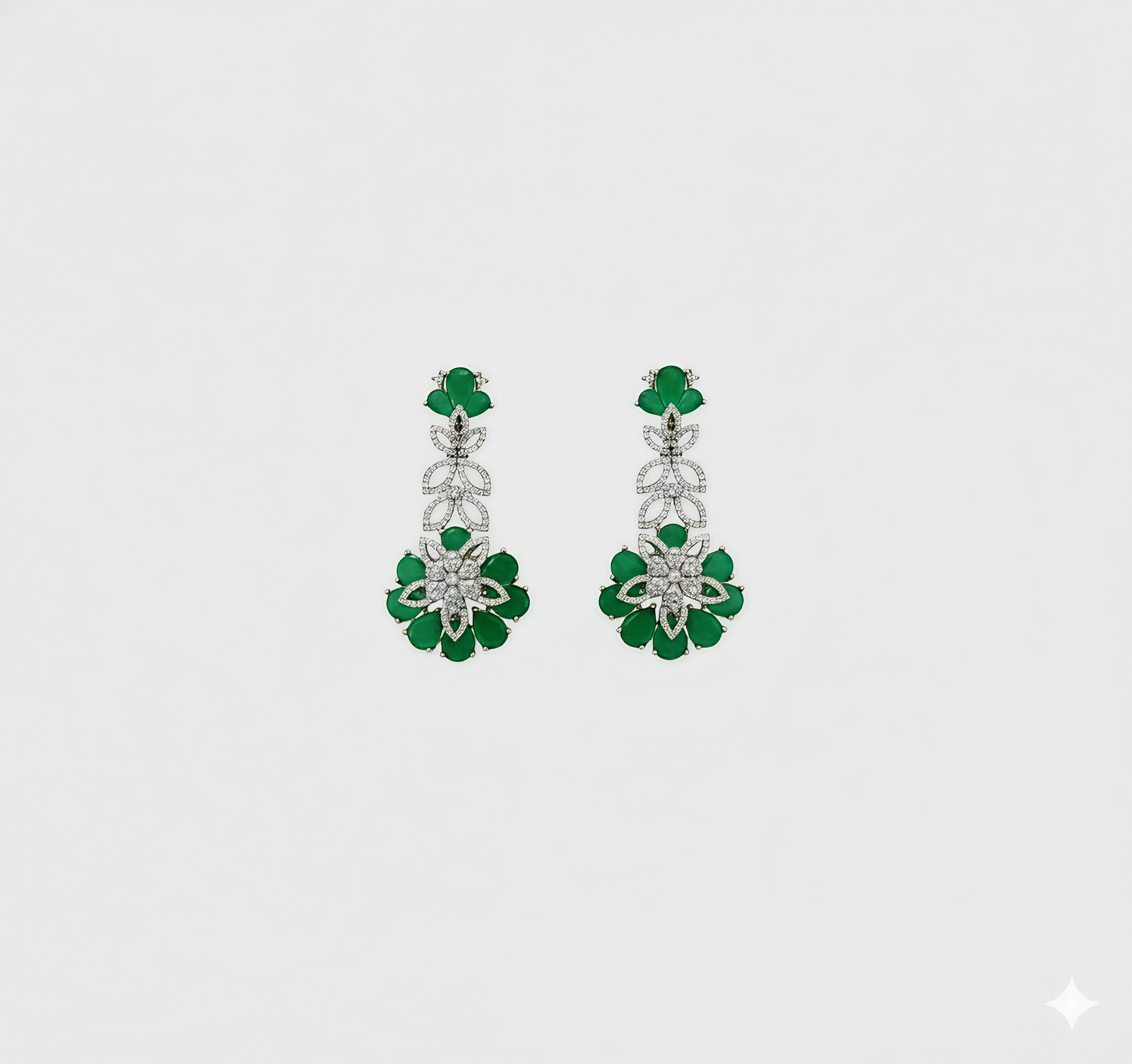 Add timeless elegance to your ethnic look with this stunning Auraa Trends silver polish necklace set, beautifully adorned with rich emerald green stones and sparkling crystal accents. Featuring an intricate floral and leaf motif design, the necklace creates a graceful statement, perfectly complemented by matching long earrings. Ideal for weddings, festive occasions, and special celebrations, this jewellery set blends traditional charm with modern sophistication.