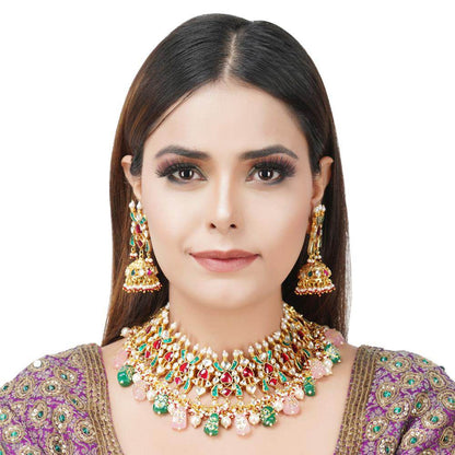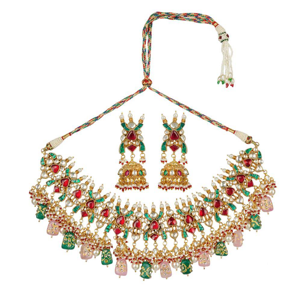 Elevate your elegance with this Dazzling Kundan Necklace Set, exquisitely 22KT gold-plated for a luxurious finish. This handcrafted masterpiece features intricate Kundan work, Meenakari detailing, and dangling pearl & gemstone beads, making it a statement piece for weddings, festive occasions, and special events. The matching jhumka earrings complement the regal design, adding charm and grace to your ensemble. With an adjustable closure, this necklace ensures a comfortable and secure fit.