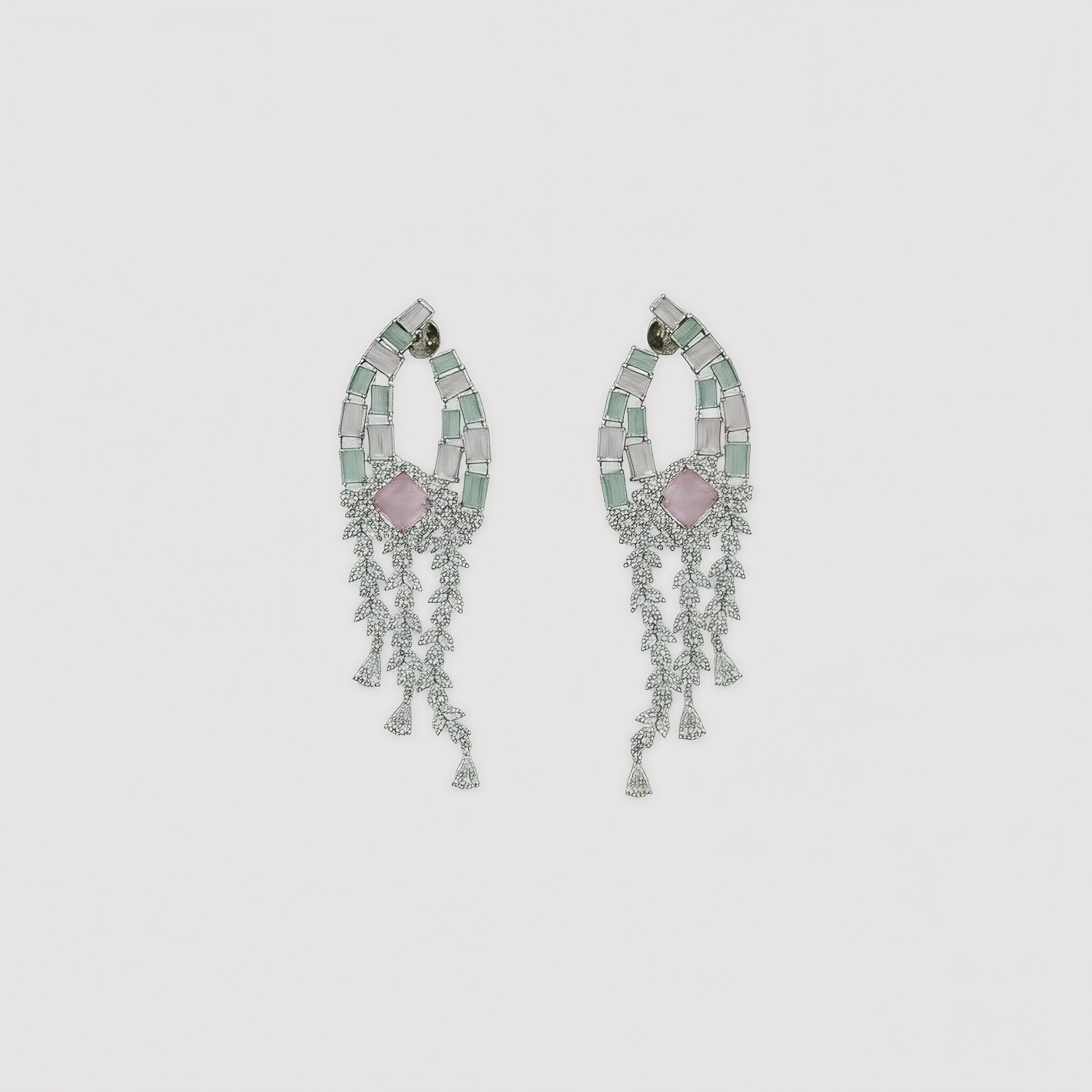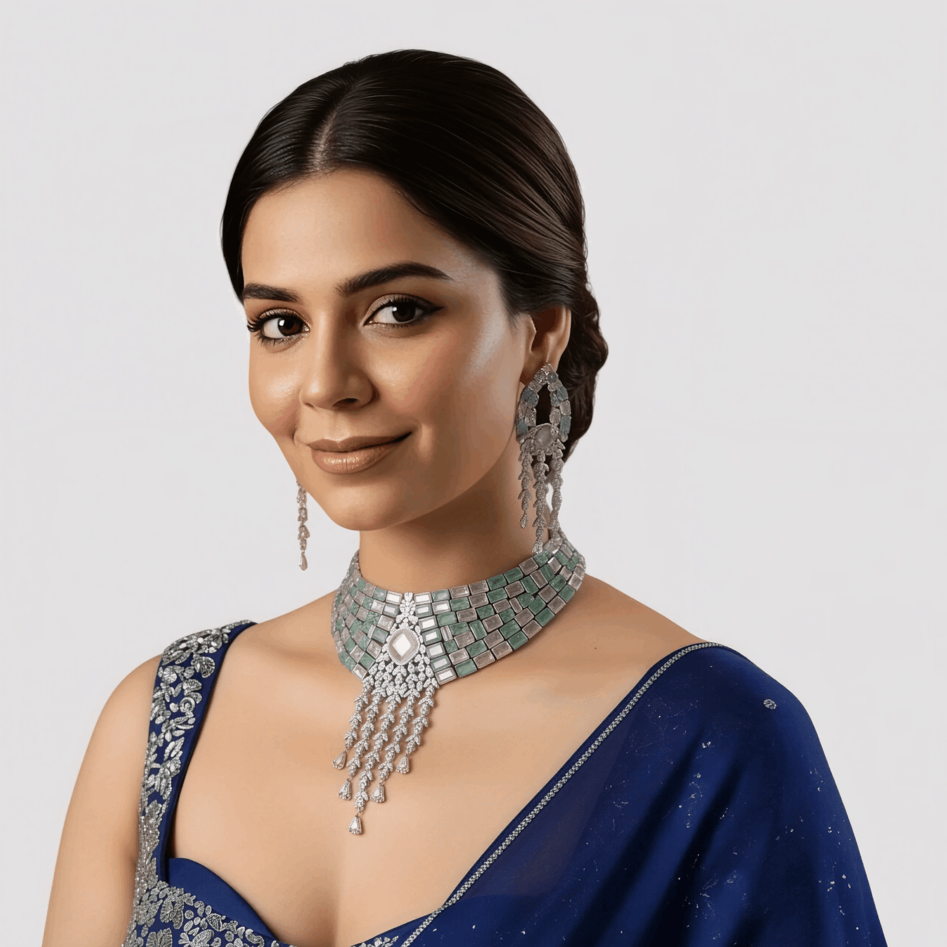 Add a touch of elegance to your ethnic ensemble with this exquisite Auraa Trends silver polish choker necklace set, beautifully crafted with pastel green and pink rectangular stones and shimmering crystal embellishments. Designed in a luxurious layered pattern, the necklace features a graceful drop detailing that enhances its regal appeal. Paired with matching statement earrings, this set is perfect for weddings, festive occasions, and special celebrations. A timeless piece that blends traditional charm with modern sophistication.