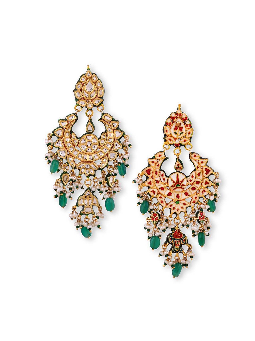 Gold-Plated Kundan Chandbaali Earrings with Green Beads