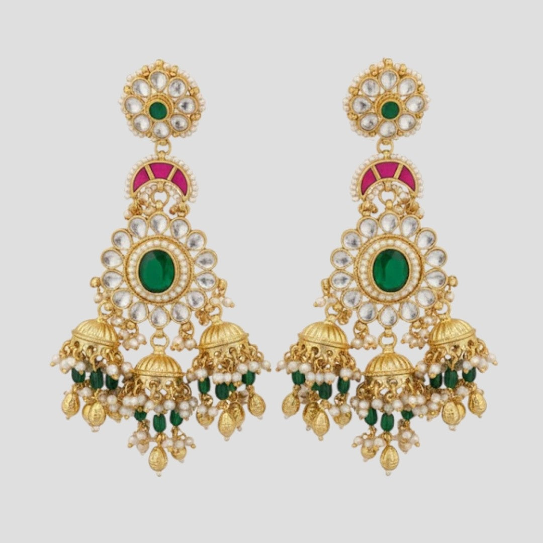 Traditional Gold-Plated Kundan & Emerald Green Jhumka Earrings for Women